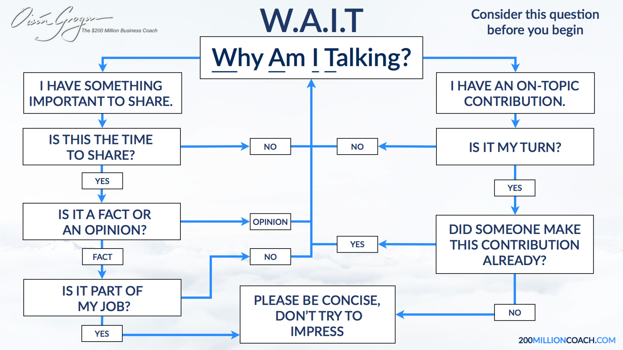 - Use WAIT (Why Am I Talking) a lot – try to be a listener more than being talkative. In general, people will like you much more, if you ask the right questions than when you talk (too much)